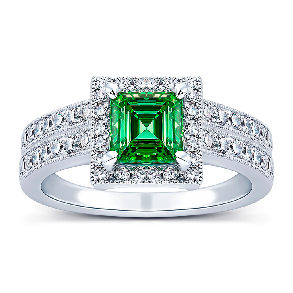 A striking blend of color and brilliance, this 1.71-carat green princess-cut diamond ring is a unique statement of elegance. Set in polished 14K white gold, the vibrant green center stone is beautifully showcased, radiating a rare and captivating hue. The clean lines of the princess cut enhance its modern appeal, while the refined setting ensures a timeless charm. Perfect for those who appreciate bold sophistication, this ring is a stunning addition to any fine jewelry collection.