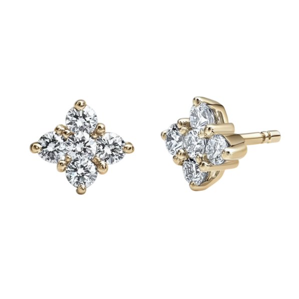Discover the understated glamour of these round cluster earrings. Featuring five precisely set round diamonds, they form a delicate cluster that captures and reflects light beautifully, adding a subtle yet captivating sparkle to your look.